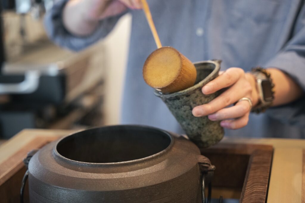 When preparing the matcha, I almost felt the tension of a traditional tea ceremony, but Kenta began smoothly mixing the lukewarm water in the tea kettle with the boiling water from the espresso machine. He explained that this method allows him to adjust the temperature depending on the type of tea and the customer’s preference.