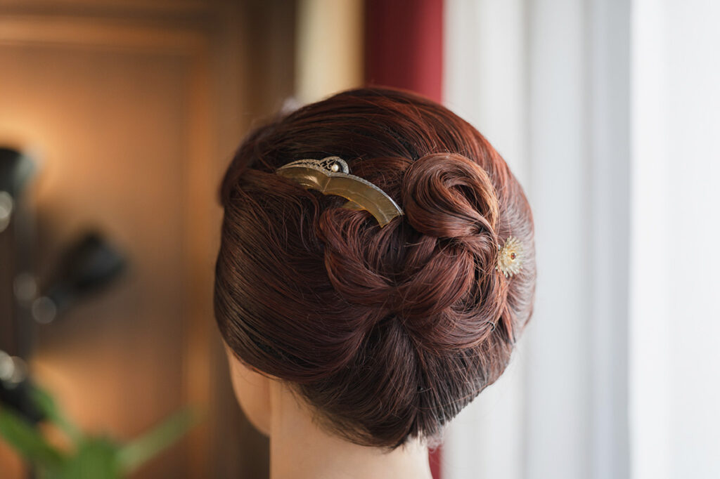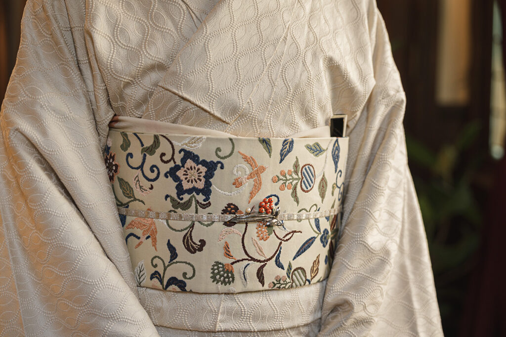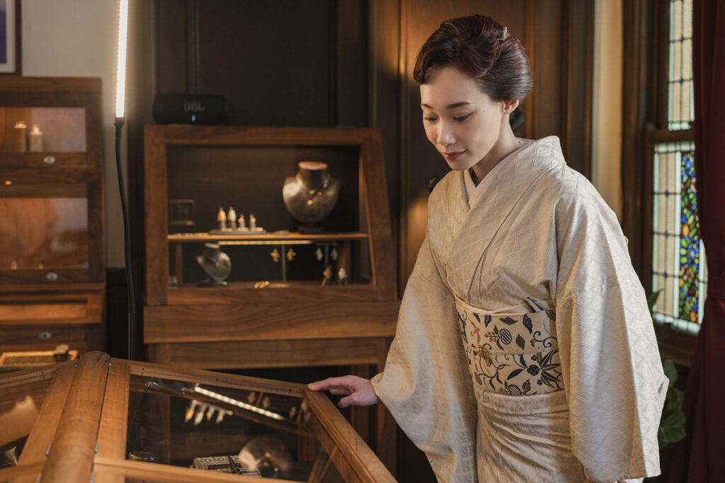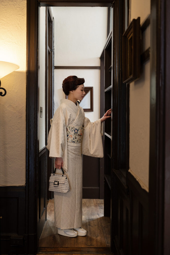 From afar, the milky-white kimono seems almost plain, but with even the slightest movement, the tatewaku pattern comes to life. crafted with weaving and embroidery, it exhibits a subtle, elegant shimmer, while the antique obi-dome and hairpin further echo the building’s historic charm.