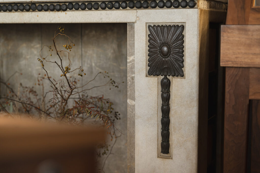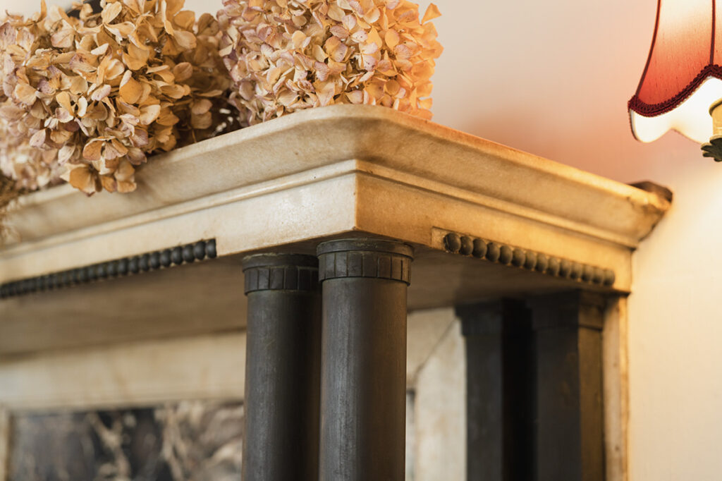 The marble mantelpiece is decorated with sleek Art Deco-style reliefs that catch Yulia’s eye.