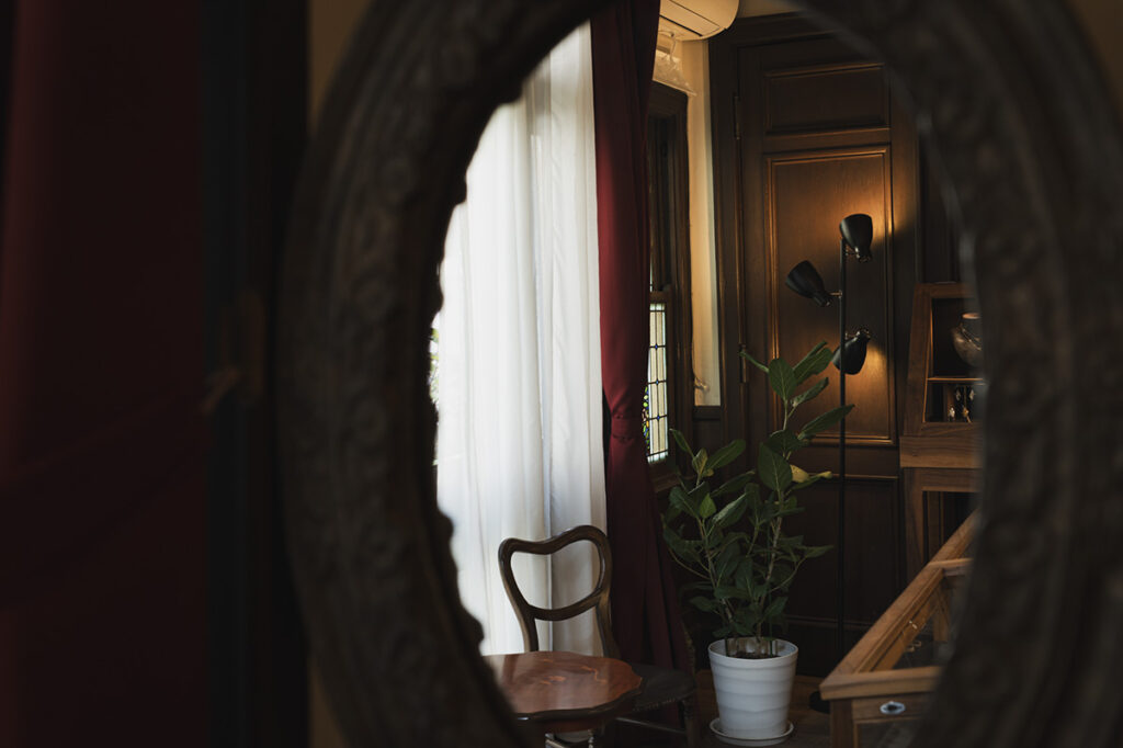 1st image: Looking into the room through the mirror feels like stepping back into an era long gone.