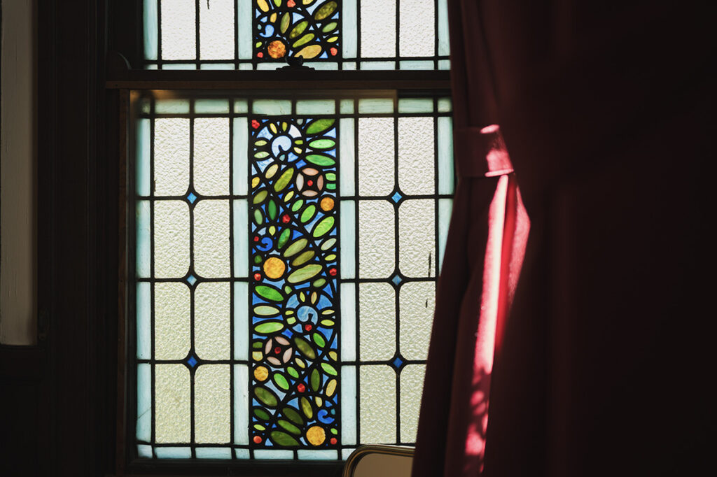 3rd image: Burgundy curtains and stained glass add an air of refined elegance.