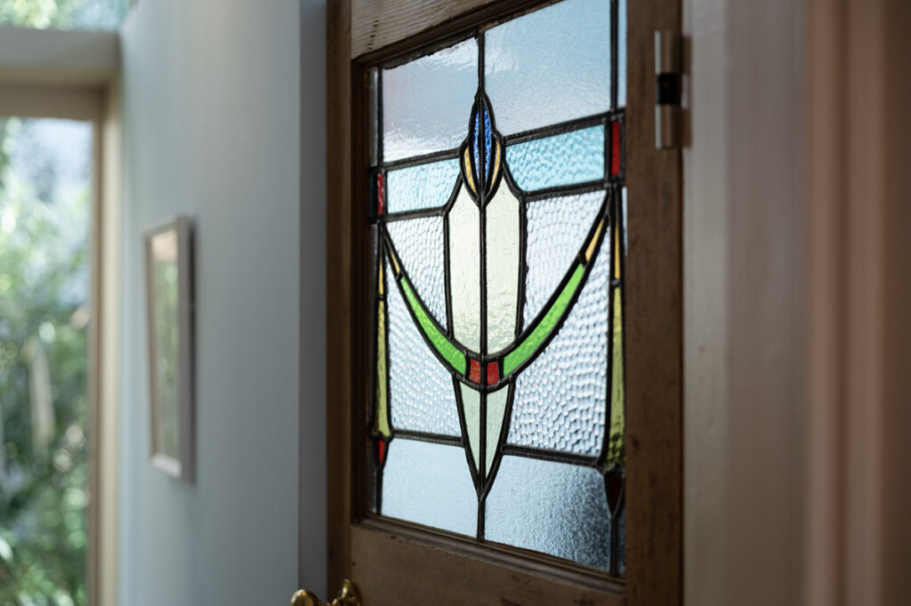 4th image: Stained glass newly installed by Tomoko to mesh with the building’s character.