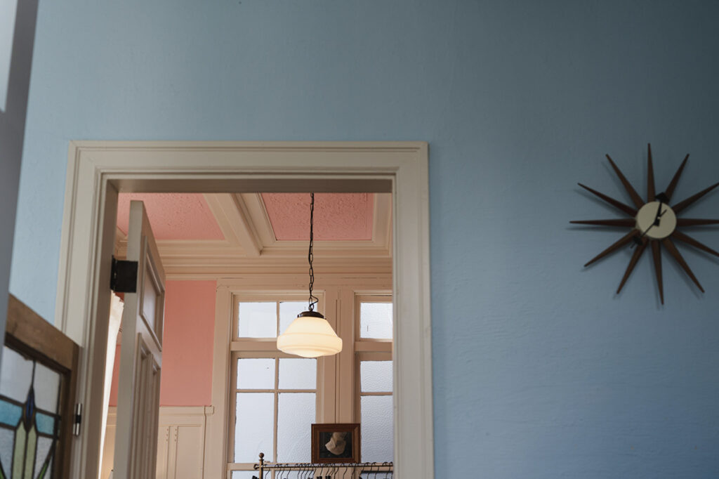 Beyond the entrance, lined with olive-green tiles along the lower walls, lies a high-ceilinged foyer. Looking up, pendant lights that have hung there since the building’s earliest days cast a soft, gentle glow across the space. “The milky glass shades carry traces of the Showa-era blend of Japanese and Western styles,” Yulia remarks, drawn to the charm of a bygone era. The original owner was a military doctor who served in World War I, and even after the building was relocated to Meguro, it continued to function as a clinic. The spacious foyer and unique layout give the building a presence that sets it apart from a typical residence. It is also said that the design was created by someone who had worked on the former residence of Marquis Maeda.