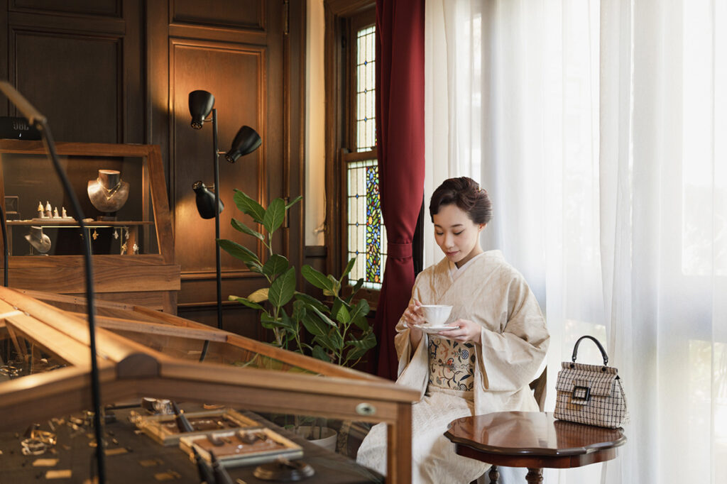 Mademoiselle Yulia is a multifaceted talent. She is active in the fashion scene as a DJ while also producing her own kimonos. In this series, Yulia, who is well-versed in art and architecture, visits her favorite spots and discusses how she coordinates kimonos that harmonize with the surroundings. For the tenth installment, she visits CASUCA HISTORIA, a jewelry boutique housed in a registered cultural property that retains the vestiges of a pseudo-western-style building from the Taishō period. The space reflects the aesthetic vision of the boutique’s owner, who breathed new life into it, and it was here that Yulia experienced moments that truly set her heart dancing.