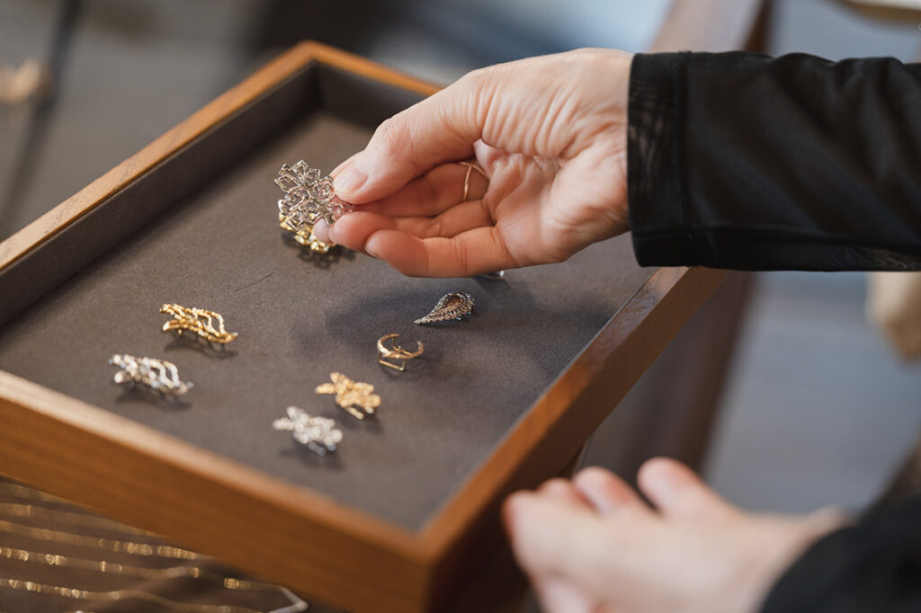 As Yulia’s gaze lingered on the obi-dome displayed in the jewelry case, Tomoko selected one inspired by a Bluebush acacia tree. “This tree was the symbolic tree of the Omotesando location where CASUCA used to be. Although we’ve moved, we designed this piece as a tribute to the tree that has always watched over us,” Tomoko explains. The Kaen Yūchōmon design produced by Yulia was now imbued with a fresh botanical sparkle.