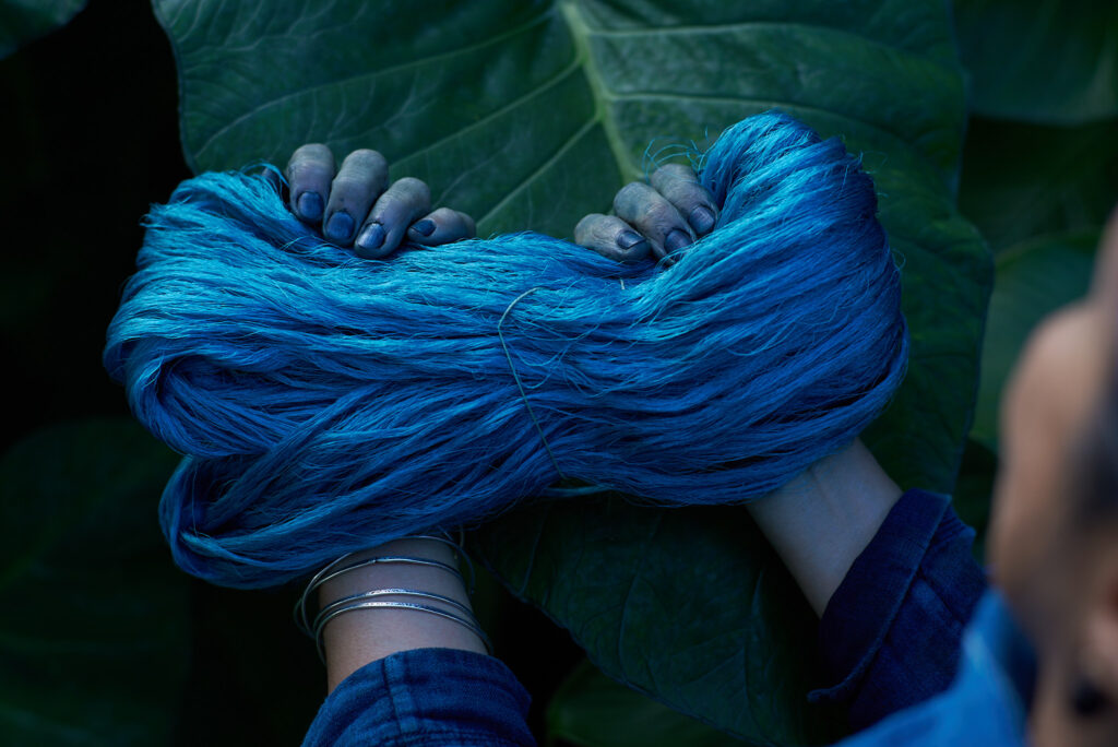 Silk threads dyed with Japanese indigo draw the eye with their quiet, refined sheen.