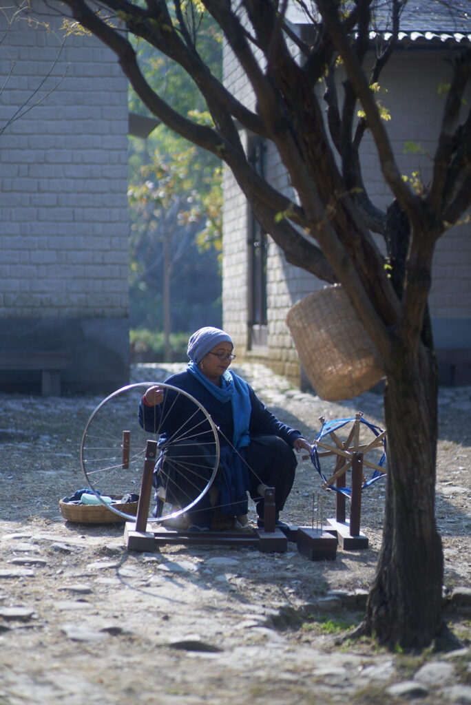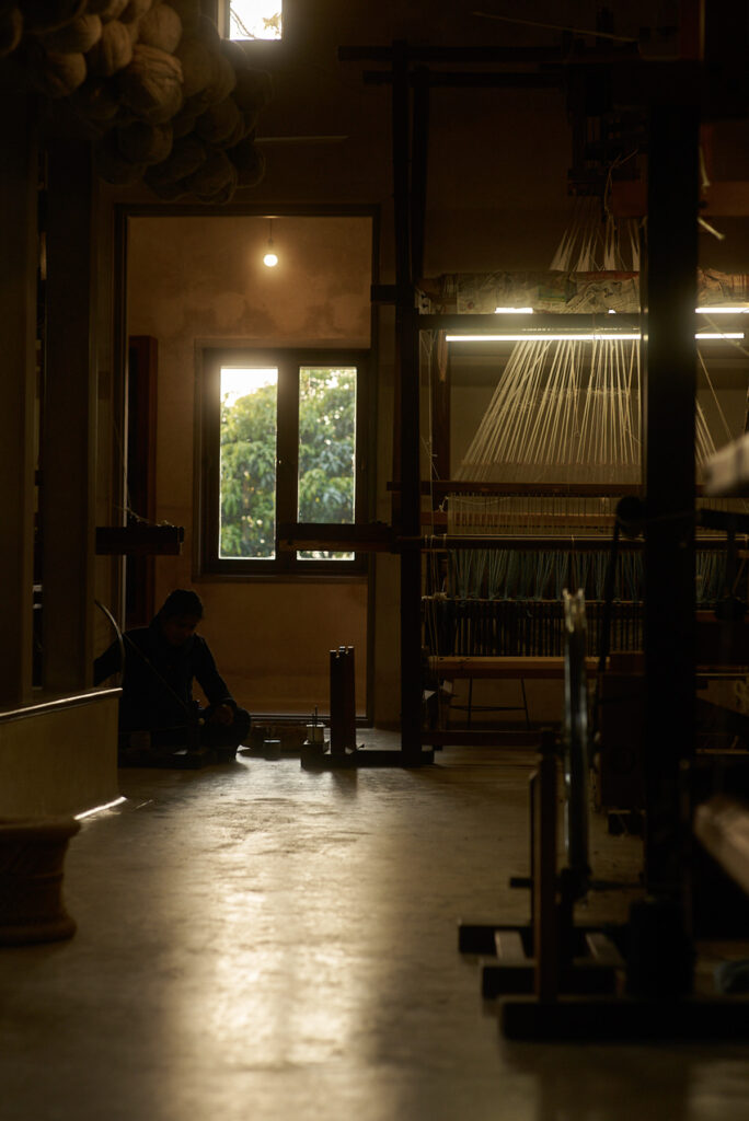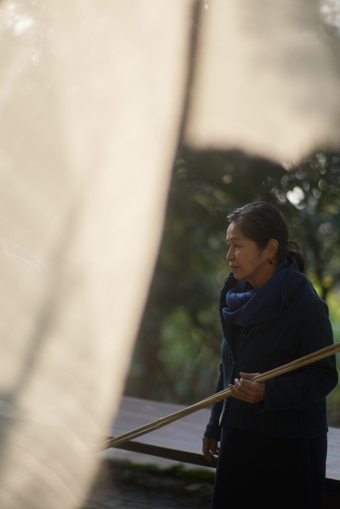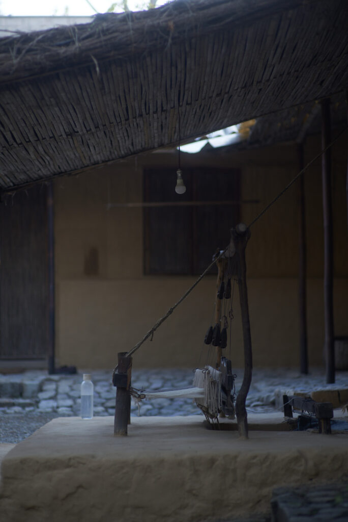 The ganga maki studio is built entirely from Earth’s natural materials. Watching threads being wound by hand using traditional tools, without any reliance on machinery, feels like glimpsing the very origins of dyeing and weaving.
