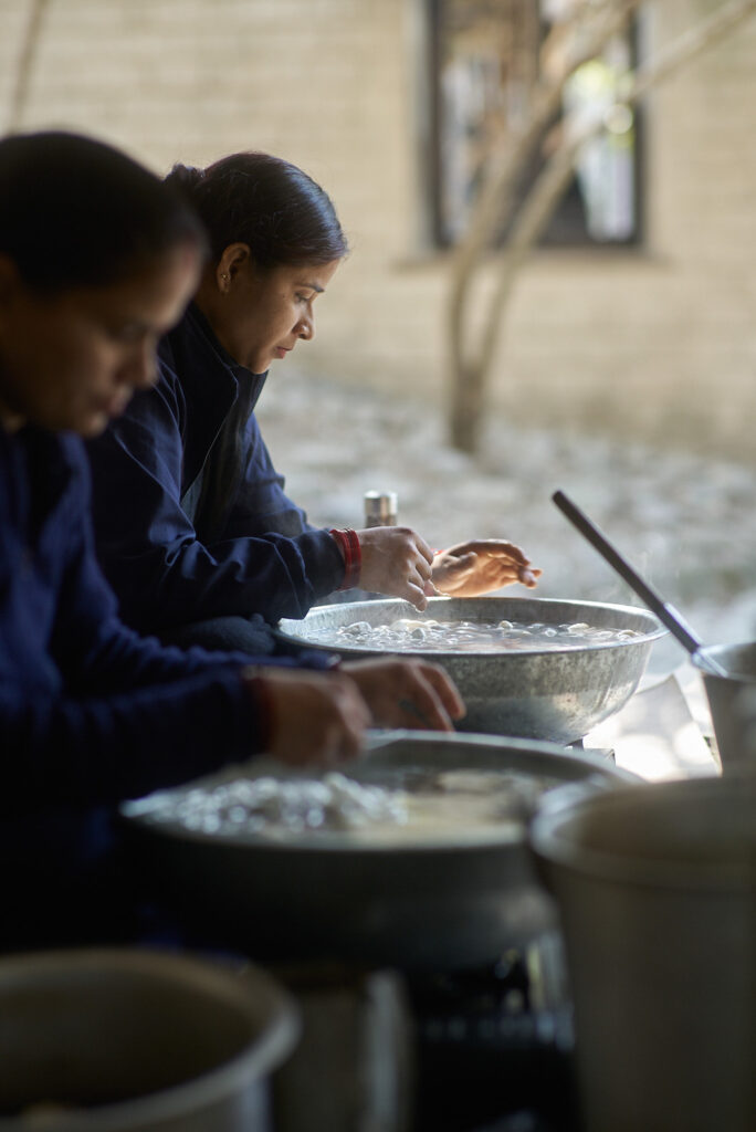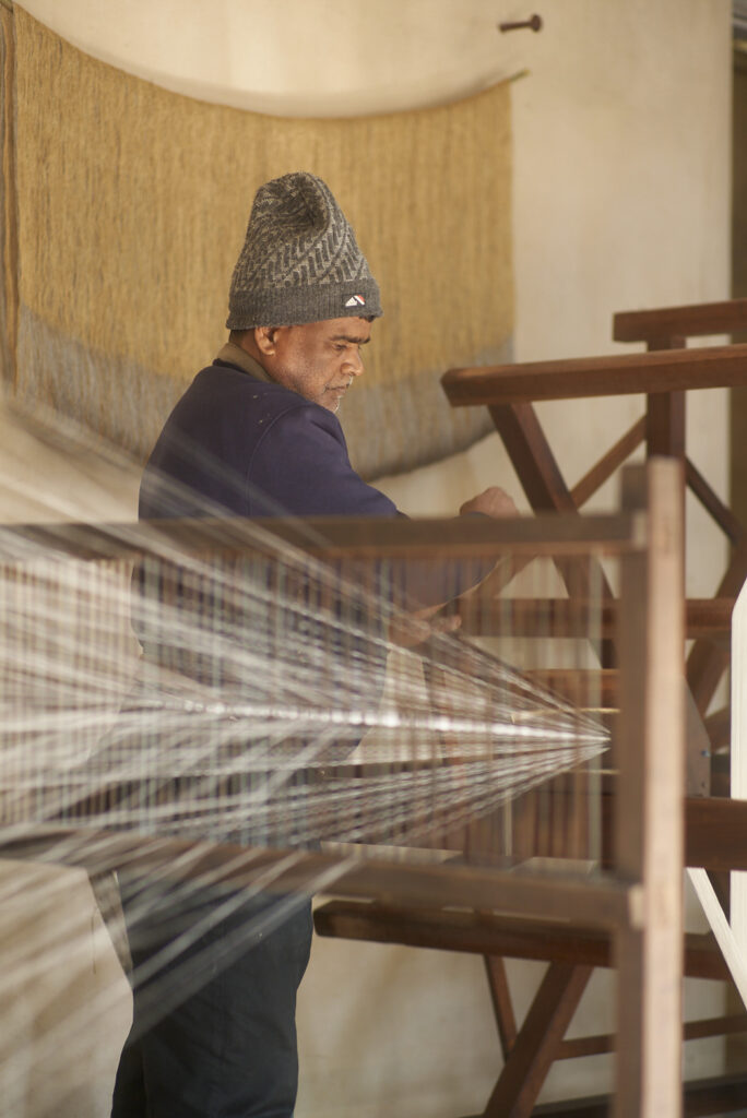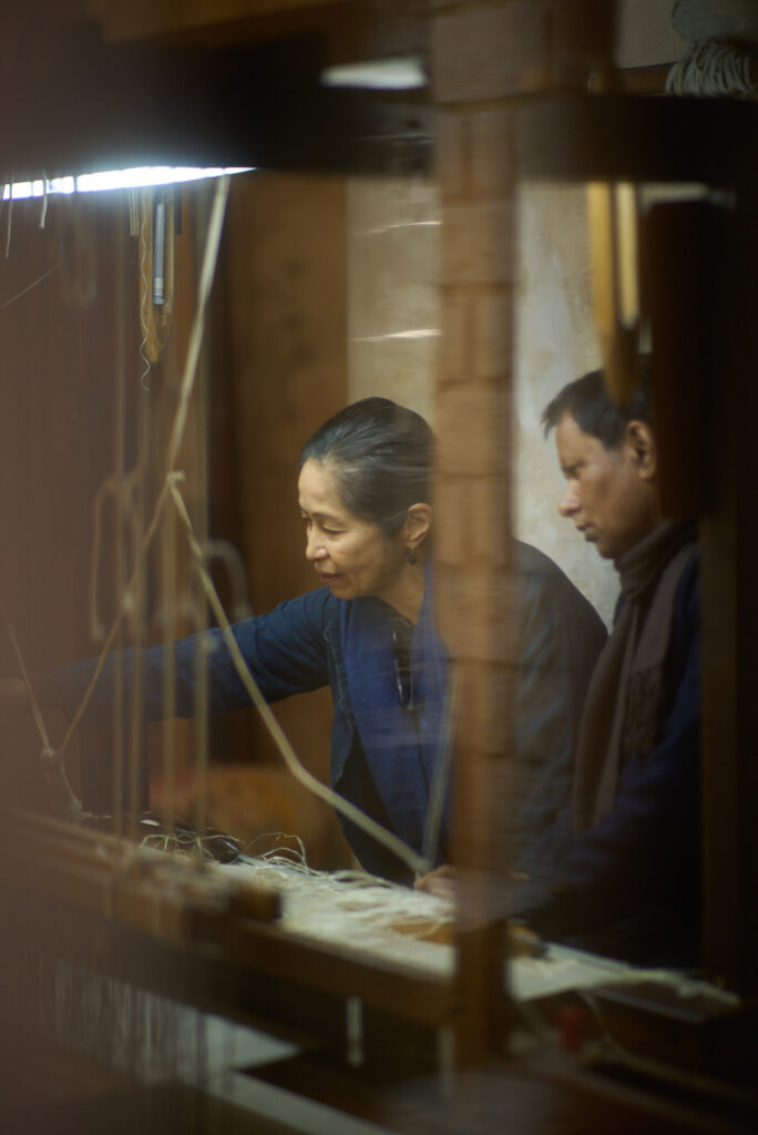 Chiaki Maki believes that “textiles live in everyday life, and those made to be used are the most beloved.” Guided by this philosophy, she creates functional woven works such as clothing, scarves, and interior fabrics. On the grounds of the ganga maki studio and the surrounding farmland, she grows fiber plants including banana and ramie, alongside dye plants such as Indian indigo, Indian night-flowering jasmine, pomegranate, and henna. Inside the studio, raw silk is hand-spun using a traditional method called zuridoshi, while indigo ferments slowly in large vats. Natural fibers come from silkworms, wild silkworm cocoons, and Himalayan wool hand-harvested in nomadic villages. These fibers are then carefully spun, dyed, and woven. By living this way and continuously growing, harvesting, and transforming plants into materials, she discovers moments of unexpected beauty in even the most routine steps of her process.