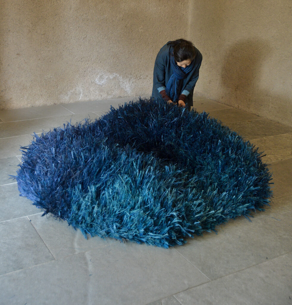 Indigo Galaxi (Bimal Himalayan wool, 150 × 160 × 50 cm). The work evokes the cycle of indigo’s color, imagined as a spiral with subtle fluctuations.