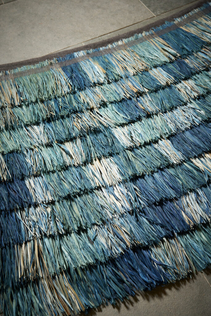One of the major tasks in her studio is cultivating and dyeing indigo. The soil is tilled, seeds are sown, the grown Indian indigo is harvested, and from its leaves, mud indigo is made in the water vats. From this cycle, Indigo Galaxi was born, reflecting the changing climate and the land’s breath. Another monumental piece is Sacred Skirt which draws inspiration from the banana trees growing on the studio grounds. It transforms the vitality and grandeur of nature not just into skirt but a garment of Mother Earth.
