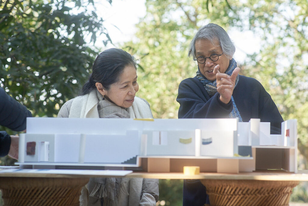 The space was designed by internationally renowned Indian architect Bijoy Jain, founder of Studio Mumbai. Touring the vast 3,000-tsubo site, Jain observed the subtle rhythms of the landscape and the contours of the land. At the center of the building, he envisioned a pond-like water vessel reflecting the moon and stars. Around it, he planted young trees over two years so they would one day cast gentle shade.